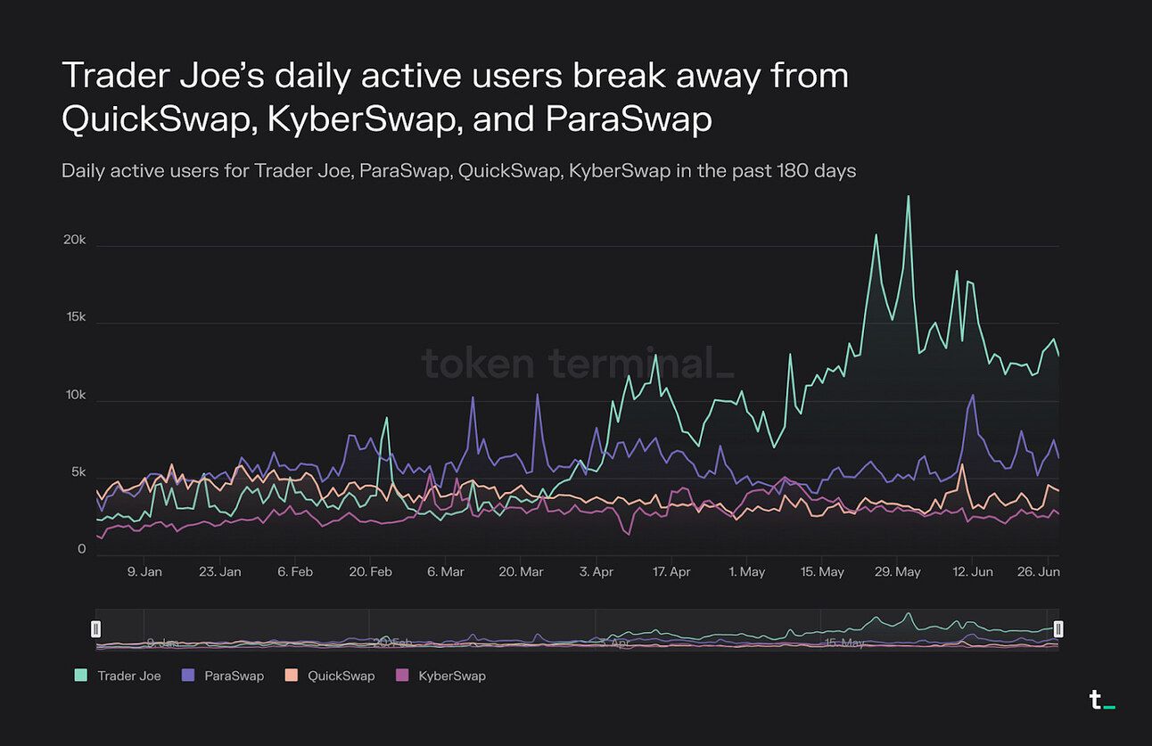 5. Trader Joe, Quickswap, KyberSwap, and ParaSwap are the best-performing projects in the DEX market sector based on growth in trading volumes over the past 180 days.