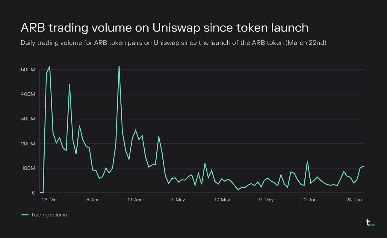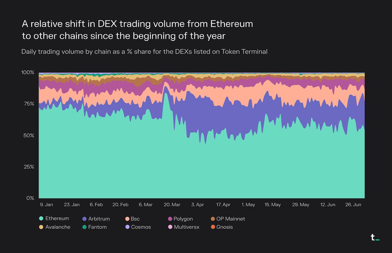 4. Since the beginning of 2023, the share of DEX trading volume on Ethereum has decreased from 72% to 54% due to growth on Arbitrum.