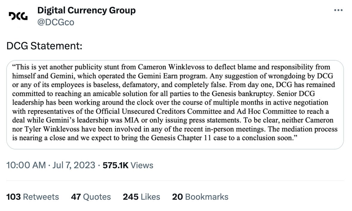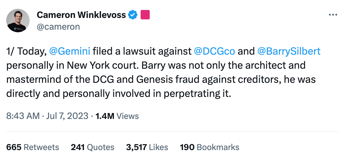 🧑⚖️ Gemini Sues Digital Currency Group and Founder Barry Silbert Alleging 'Fraud'- Crypto trust firm Gemini sued Digital Currency Group last Friday, alleging the industry conglomerate and its founder Barry Silbert committed "fraud" through DCG subsidiary Genesis, which held funds for Gemini tied to the latter company's Earn program. See the complaint here.