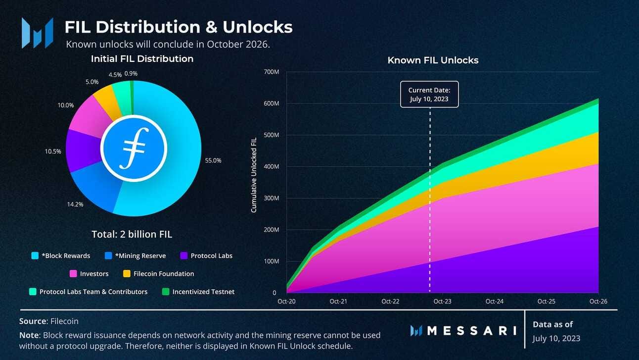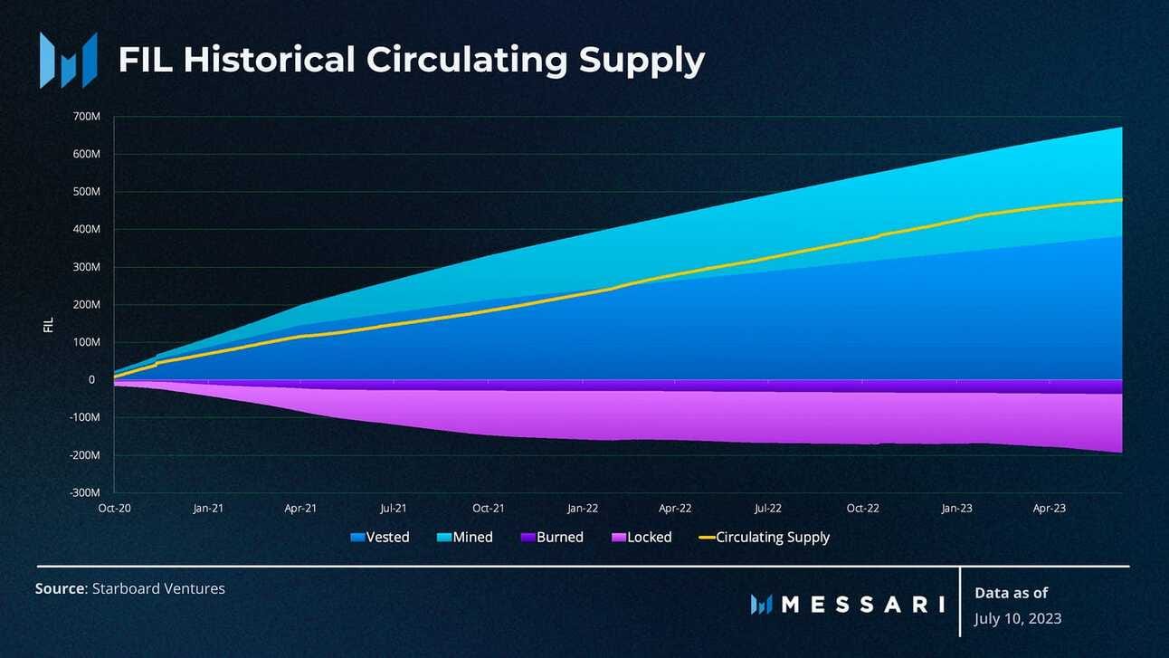 Vested FIL tokens are added to the circulating supply according to the above vesting schedule. The known FIL unlocks for investors, the Filecoin Foundation, and Protocol Labs and its team total 600 million FIL (30% of the maximum supply of 2 billion FIL) and are scheduled to conclude in October 2026. As of July 10, 2023, vesting is 61% complete. According to the current cryptoecon specs, the FIL mining reserve (283 million FIL) is dormant, and there are no ongoing proposals to modify the specs. As such, the FIL mining reserve is not included in the circulating supply calculations.