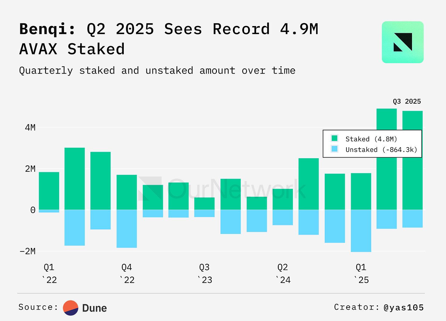 5. Benqi, Avalanche's premier liquid staking protocol, has achieved record-breaking growth in the last two months, pushing the total liquid-staked AVAX (sAVAX) to its all-time high. This surge has resulted in a net total of over 16.6M AVAX ($423M) being secured by the platform. Backed by a solid 5.05% APR, the average staking volume in July-August 2025 has been 3-4 times higher than any previous period, signaling a massive new wave of capital inflow.