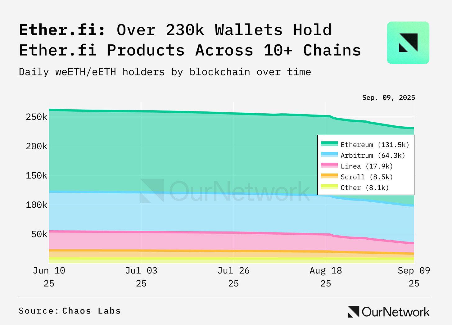 2. Ether.fi continues to lead the liquid restaking sector (LRT) sector with dominant ecosystem traction. Currently, its flagship LRT, weETH/eETH, saw supply reach almost 2.9M ETH, reinforcing its role as a prominent staked ETH collateral. Over 230K wallets hold Ether.fi products across chains. Ethereum leads with over 130K wallets. Arbitrum is next with 64K wallets. And Linea has almost 18K wallets holding Ether.fi tokens.