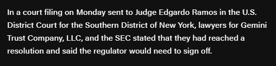 ✍️ SEC, Winklevoss-led Gemini reach 'resolution in principle' over years long lawsuit involving Gemini Earn:The U.S. Securities and Exchange Commission and Gemini have reached "a resolution in principle," after the agency accused the crypto exchange of not following its rules when it launched a crypto lending program.