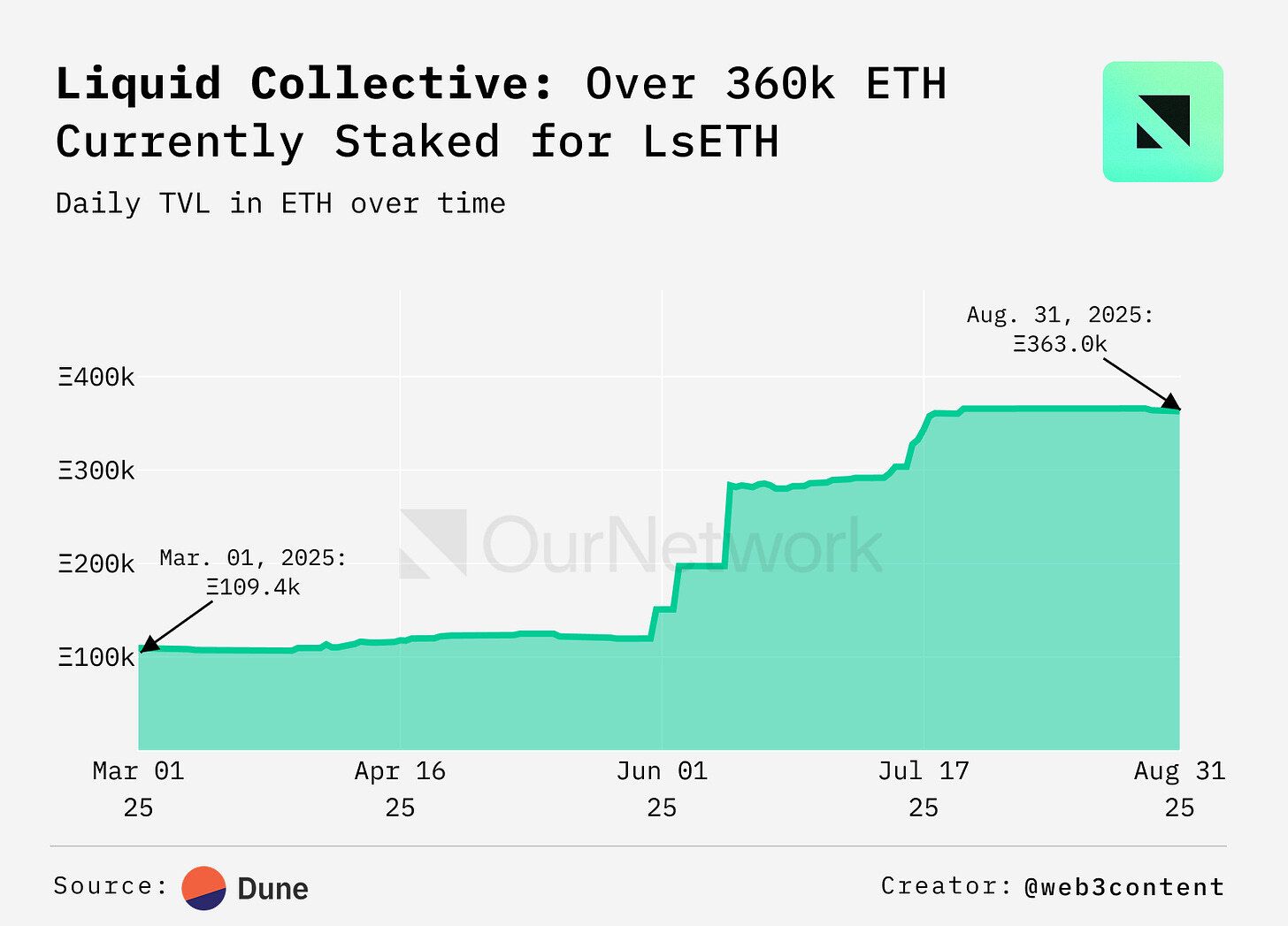 3. Liquid Collective is an institutional-grade liquid staking protocol designed for enterprise compliance and security, a focus which has positioned it to capture significant inbound stake from the emerging corporate treasury sector. Digital Asset Treasury (DAT) inflows have contributed to a 231% surge in LsETH’s TVL over the last six months, as companies adopt LsETH for a liquid, multi-operator, onchain staking solution to make their ETH holdings productive.