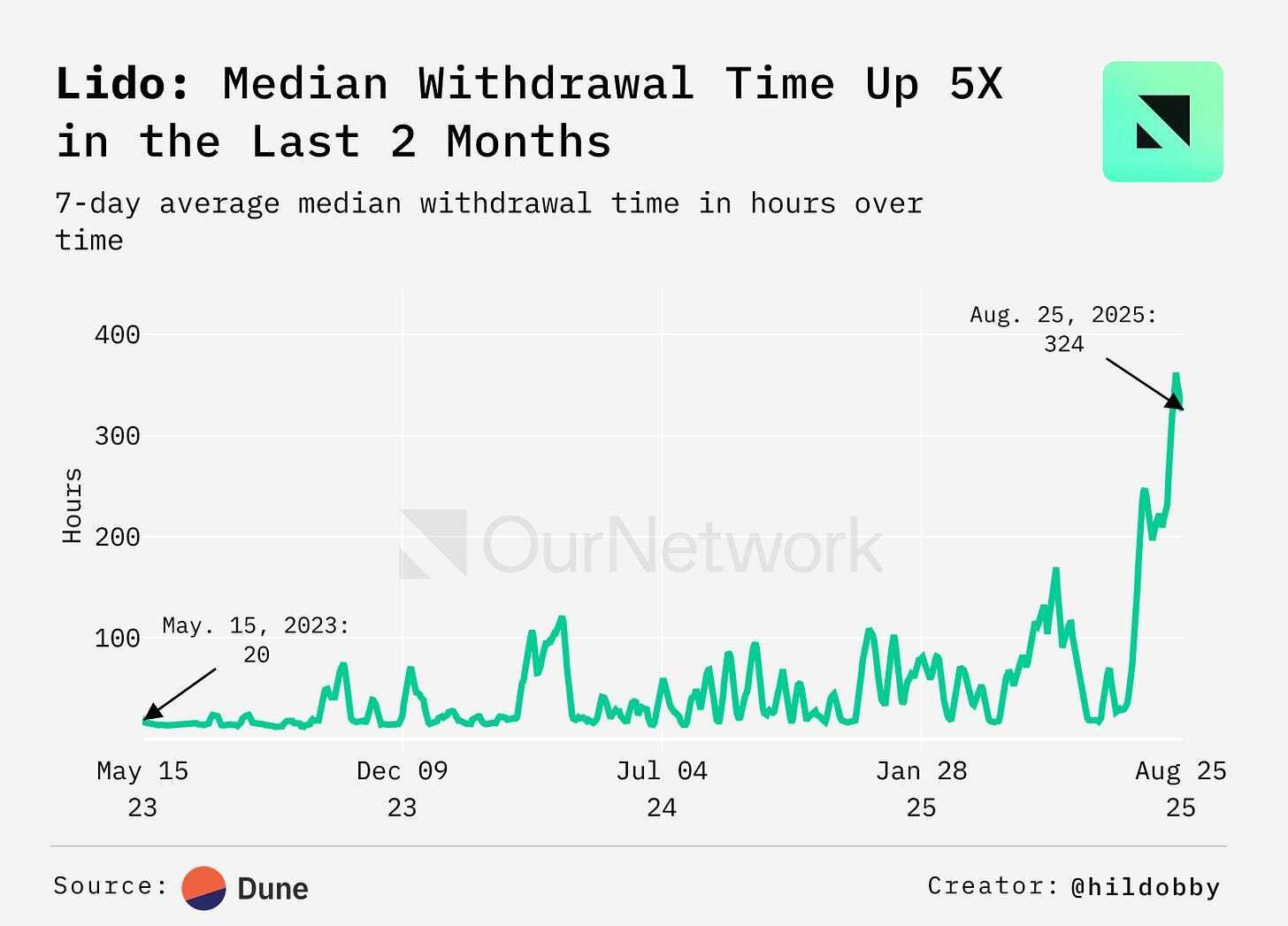 Participation in Lido underwent a shock in July. An ETH liquidity crunch impaired a popular Lido stETH earn strategy on Aave. stETH faced a selloff and temporary depeg, and a spike in unstake volume that increased the withdrawal wait by a factor of 20. Neither Lido’s nor overall Ethereum unstake queue fully recovered.