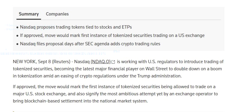 ⚖️ Nasdaq seeks SEC nod to trade tokenized securities alongside traditional stocks: Nasdaq is pushing for permission to allow tokenized versions of listed stocks and ETFs to trade on the same order book as their traditional counterparts, a first-of-its-kind push that could bring blockchain-based settlement into the national market system as soon as the third quarter of 2026 if approved.