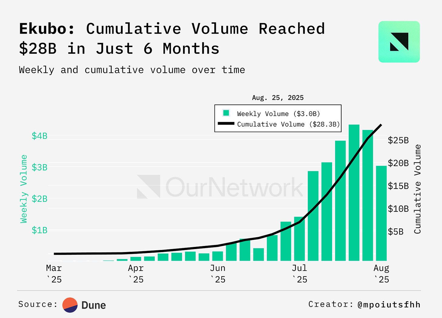 4. Ekubo Protocol is an automated market maker deployed on Ethereum and Starknet, designed for capital efficiency and modularity. With liquidity ticks 100 times smaller than Uniswap v3, a singleton “till” design that minimizes gas, and extensible pools for features like TWAMM or oracles, Ekubo enables $1k to perform like $100k elsewhere. In just six months it has surpassed $27B in cumulative volume and 1.06M trades, making it one of the fastest-scaling DEXs.