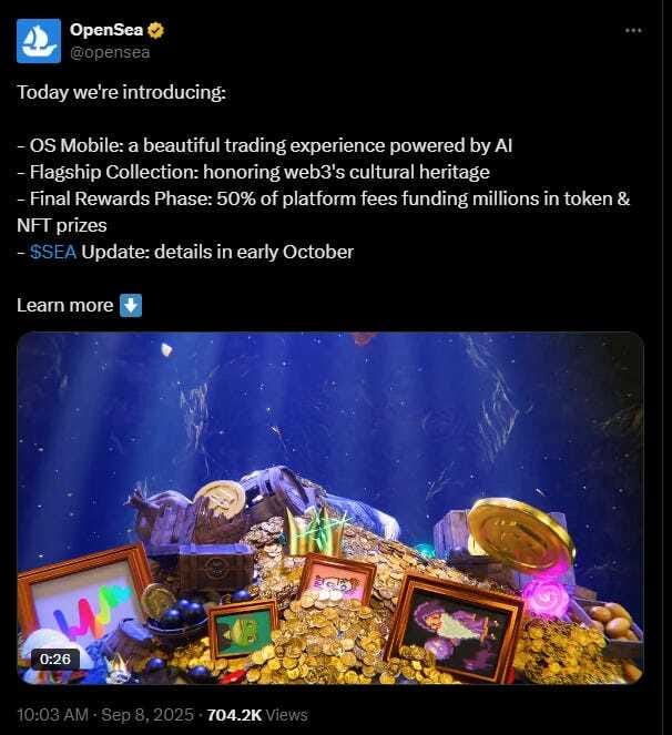 🚀 OpenSea Reveals 'Flagship' NFT Treasury Stockpile as SEA Token Drop Nears:Prominent NFT marketplace OpenSea said Monday that it has committed more than $1 million to acquiring culturally relevant NFTs as it charges towards the launch of its native ecosystem token, SEA.