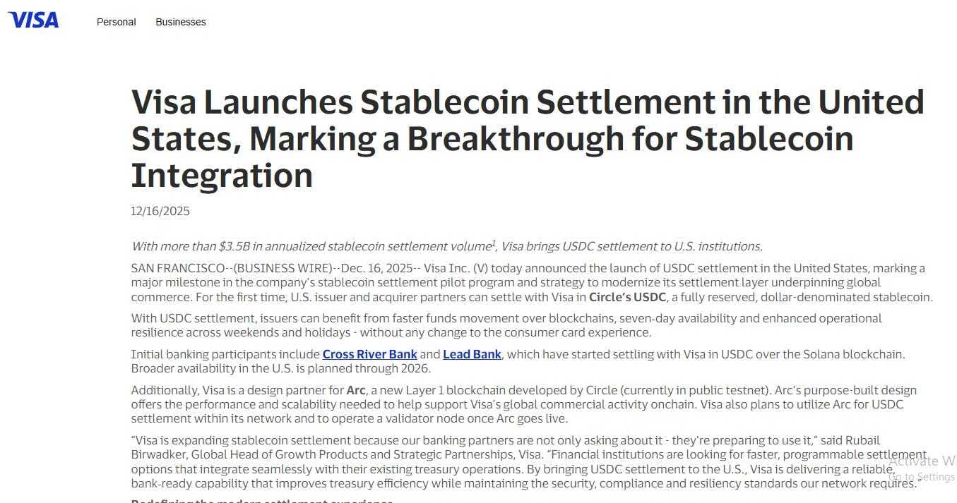 🎉 Visa launches stablecoin settlement in US via Circle’s USDC on Solana:Visa is launching a stablecoin settlement service in the U.S., underscoring growing institutional interest in blockchain-based payment rails.The payments giant said Tuesday it will allow U.S. financial institutions to use Circle’s for back-end payment flows over Solana, with Cross River Bank and a16z-backed Lead Bank among the first to participate.