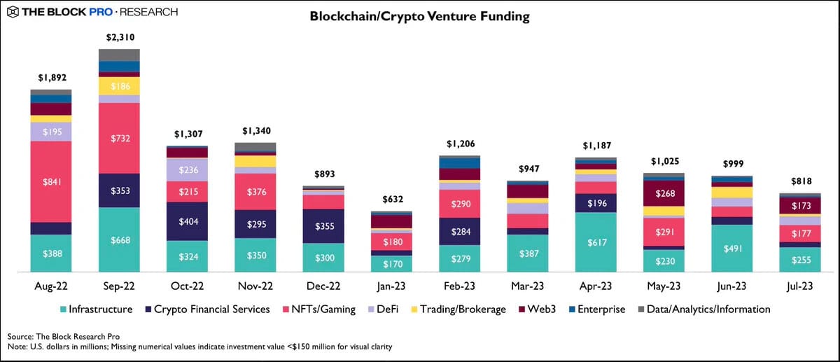 4. It’s been a challenging climate for Crypto VC. July had the fewest VC deals YTD. July funding had ~18% decrease in dollar terms from June. July was the 4th consecutive month in this downtrend