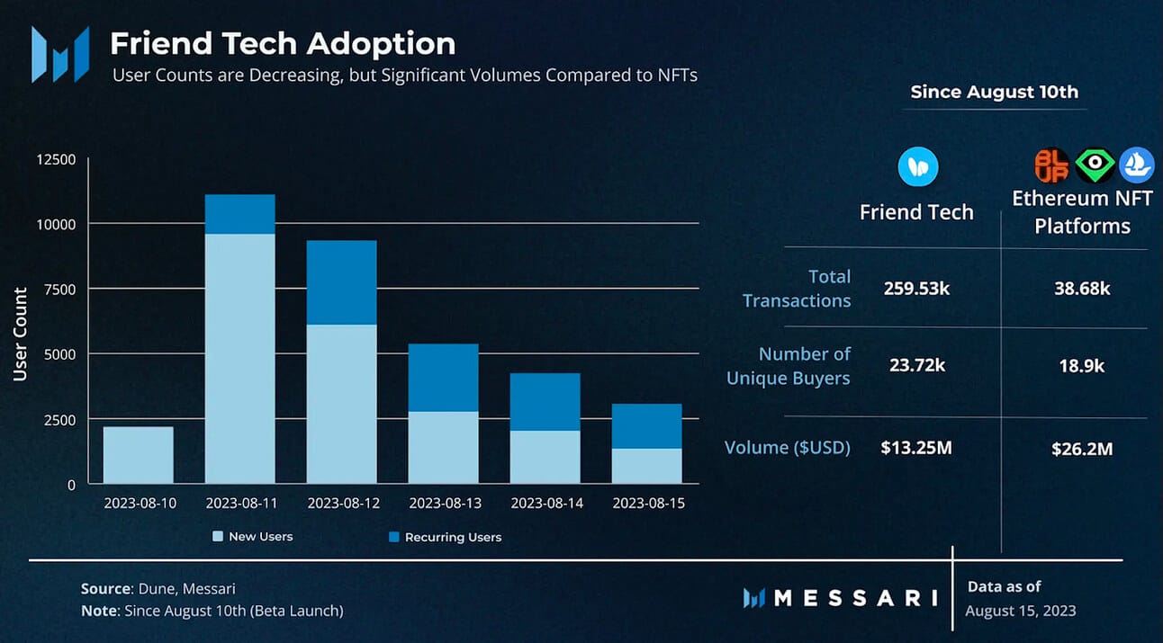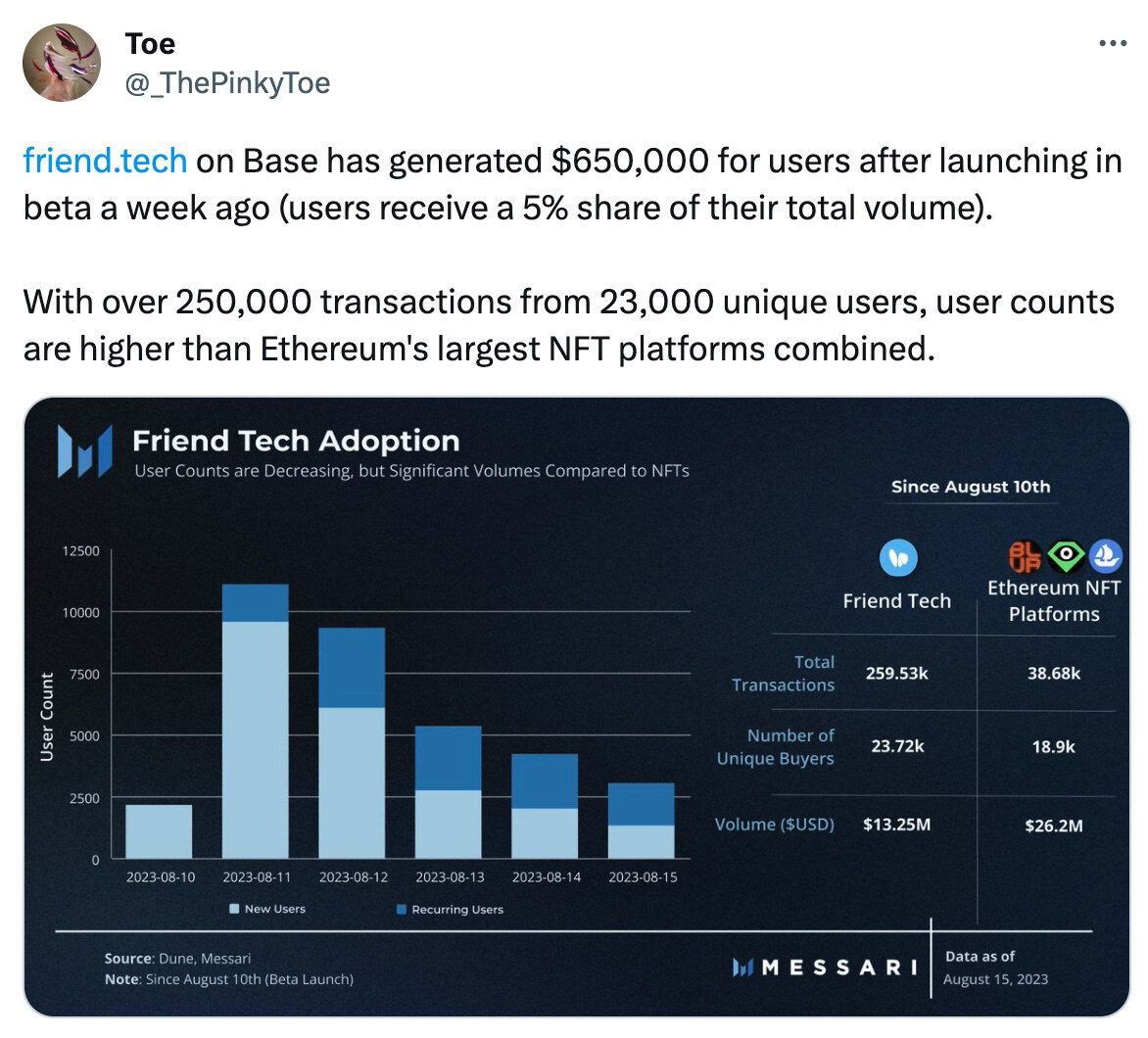 Users on friend.tech receive 5% of their share’s volume which is a much greater percentage than other Web3 consumer applications (Lens/NFTs), let alone traditional channels (Twitter/Instagram). This has translated to $650,000 in user revenue on $13.25 million in volume in only one week. Additionally, friend.tech’s total transactions and user counts are higher than Ethereum’s largest NFT platforms since its launch. While these aren’t 1:1 comparisons, it highlights the potential growth for both creators and speculators alike.