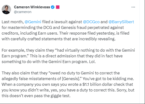 ⚖️ Cameron Winklevoss to DCG Amid Their Crypto Lending Fight: 'Good Luck' Convincing a Jury- The verbal battle between the Winklevoss twins’ Gemini crypto exchange and Digital Currency Group, the crypto conglomerate that had helped power a now-frozen Gemini lending service, continued Friday, a day after DCG sought to dismiss a fraud lawsuit.