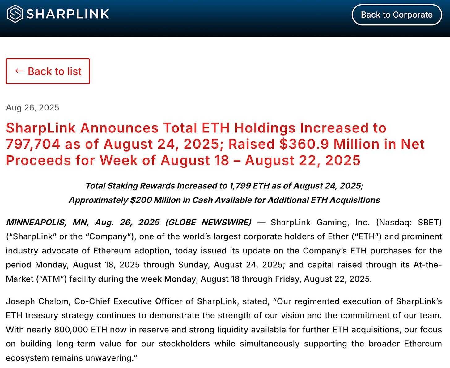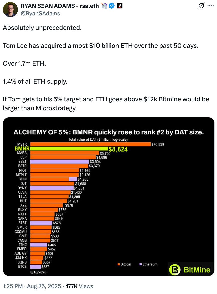 👑 SharpLink ETH treasury at $3.6 billion after adding over 56,000 ether: SharpLink now holds 797,704 ETH after last week adding 56,533 ether for around $252 million; putting its Ethereum treasury valued at $3.64 billion.