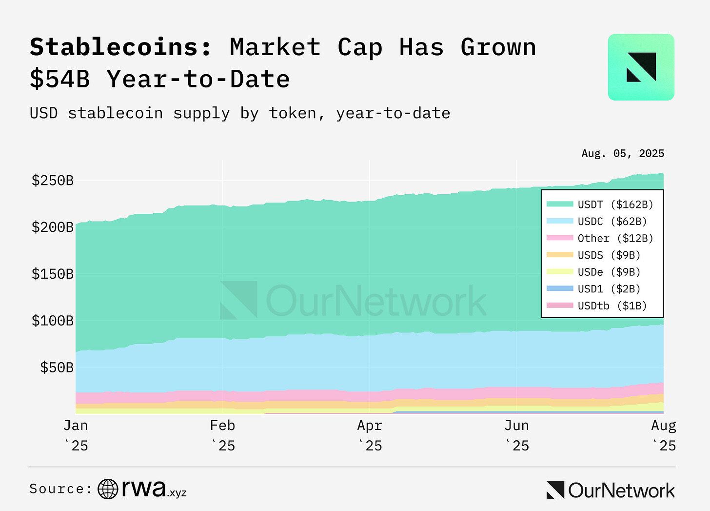 3. Stablecoins Surge Past $257B, Adding $54B in 2025 Showcasing the Fastest Year-to-Date Growth Since 2021