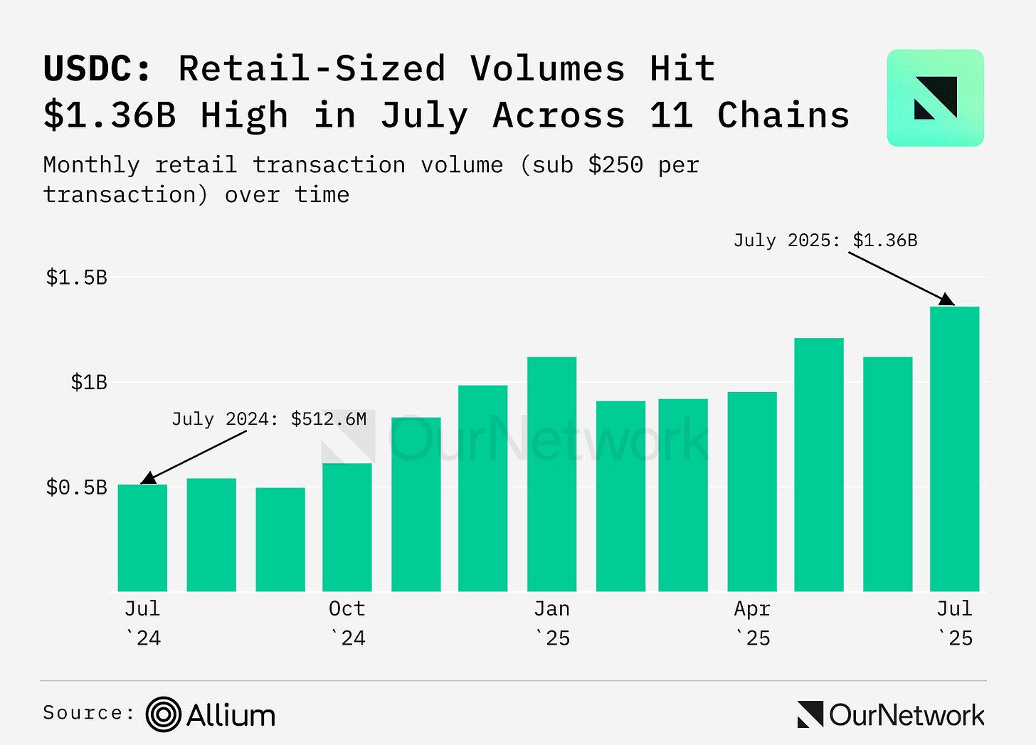 In July, retail-sized USDC volumes hit a record high of $1.37B across 11 networks. Solana led with 33% of these volumes, followed by Polygon at 17% and Arbitrum at 12%. Allium defines retail transactions as organic transfers under $250.