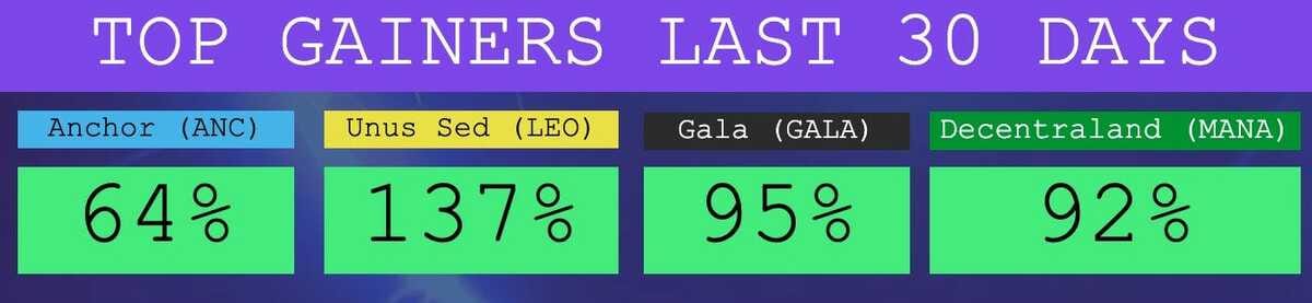 The Top Performers This Month from the Top 100: Anchor is a Yield protocol, Unus Sed is an Exchange Token, Gala is a Gaming Token, Decentraland is a Metaverse.