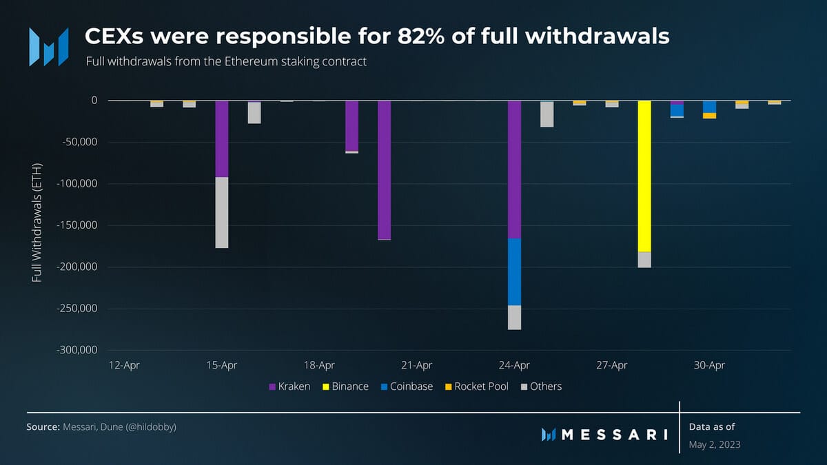 Centralized exchanges have been the primary contributors to full withdrawals, collectively accounting for 82% of the ETH withdrawn. Kraken was responsible for 48% of the ETH withdrawn as it had to cease its staking program in the United States per a settlement with the Securities and Exchange Commission (SEC). Binance and Coinbase follow Kraken, accounting for 18% and 11% of the full withdrawals, respectively.