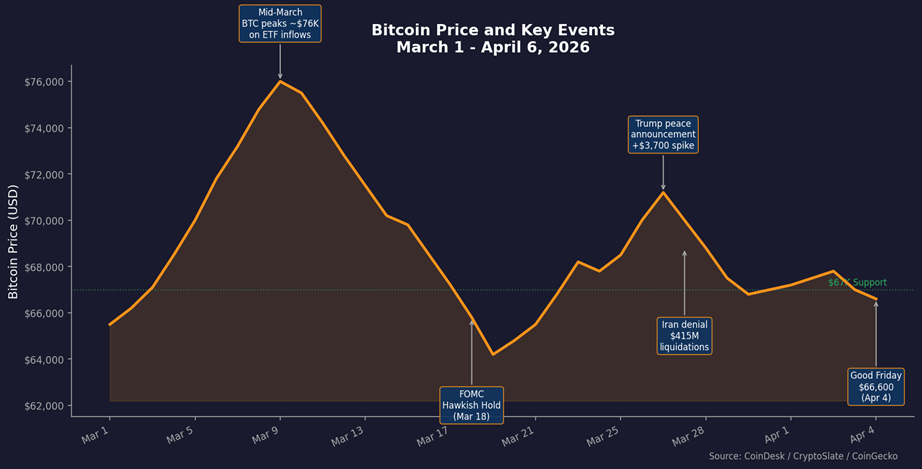 Bitcoin Price and Key Events | March 1 - April 6, 2026 | Source: CoinDesk / CryptoSlate