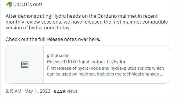 🚀 Cardano’s hydra scaling solution goes live on mainnet as Ethereum gas fees surge - The first Hydra node compatible with the Cardano mainnet was launched on May 11, according to developer Sebastian Nagel.