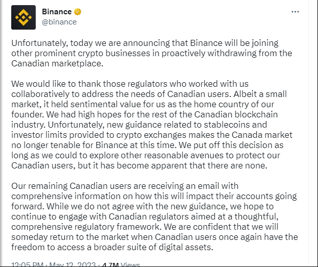 🚩 Binance Halting Operations in Canada- Binance said in a May 12 tweet that it would be halting operations in Canada.The cryptocurrency exchange said that it is joining other crypto companies who are “proactively withdrawing from the Canadian marketplace.”