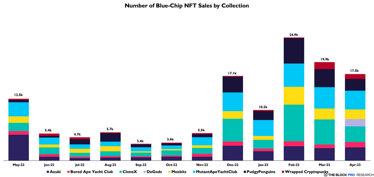 3. The total number of blue-chip NFT sales fell from 19.9K to 17.5K, a 12.2% MoM decrease. Bored Ape Yacht Club (BAYC) was the only collection to have an increase in the number of sales throughout April.