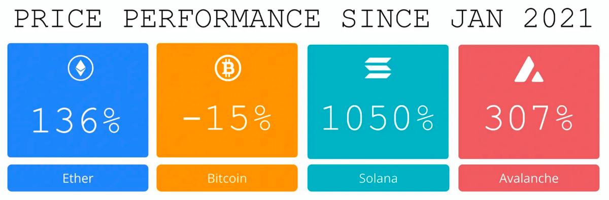 Price performance of the leading L1s since we began writing Coinstack in January 2021
