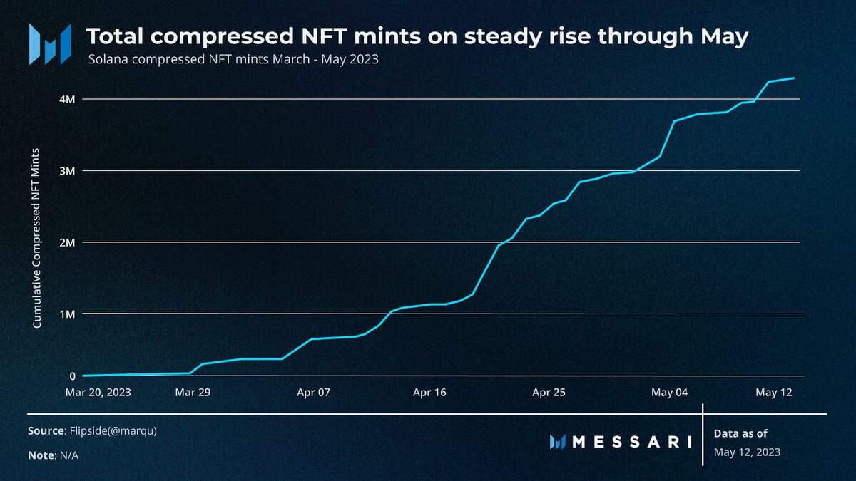 Compression has seen an explosion of adoption since its launch in mid-March. Notable teams have migrated to Solana in part to make use of the standard (Helium and Render), and many other Solana-native teams have directly used (Dialect, Crossmint, Drip, and others) or facilitated the usage (easy-use compression APIs from Metaplex and Underdog) of state compression.