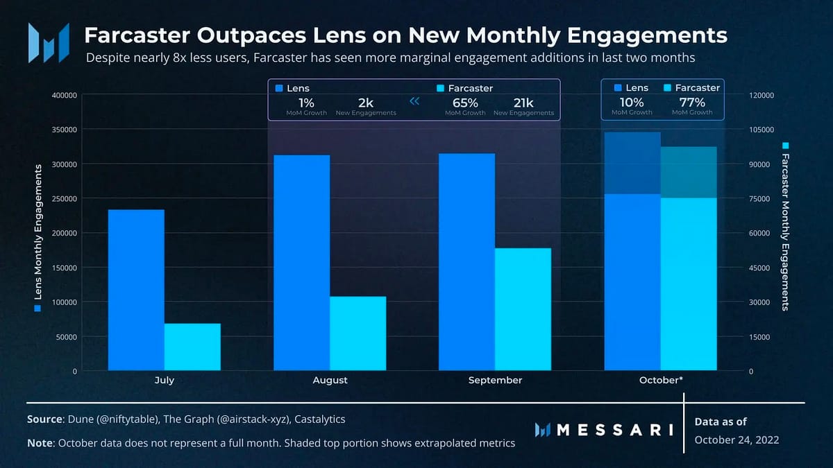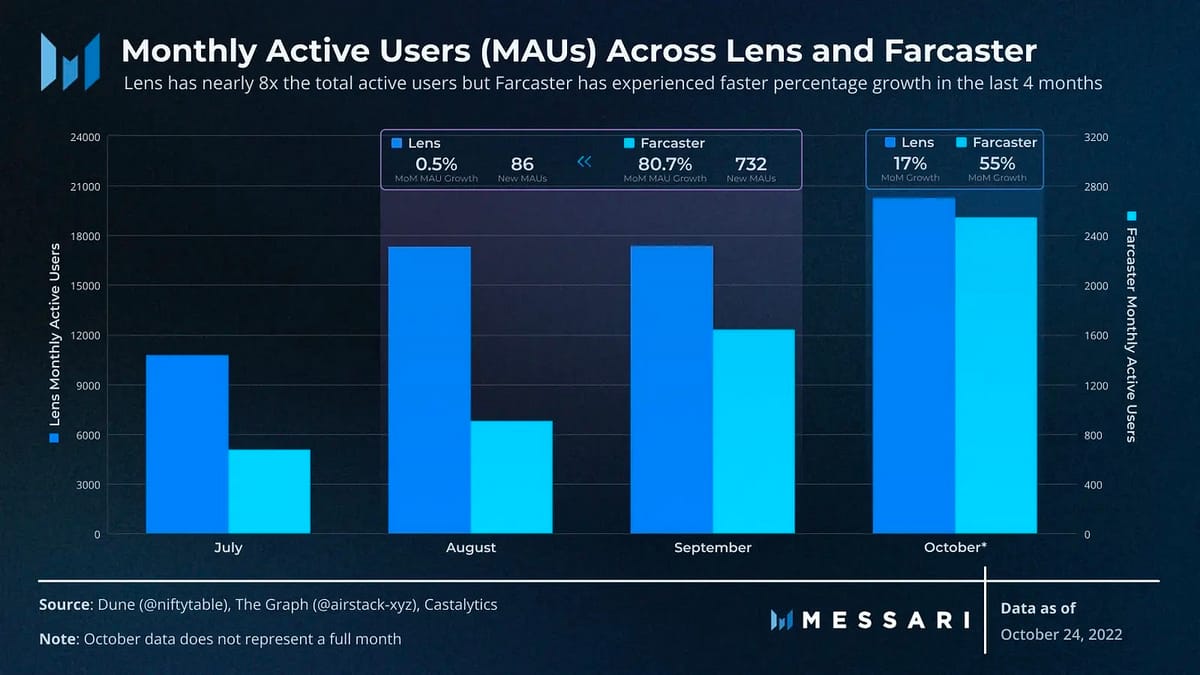Going from September to October, Lens experienced more growth than the previous month, with a 17% active user uptick. Farcaster again outpaced Lens on a percentage basis, growing MAUs by nearly 55% over so far in October.