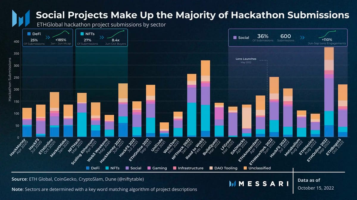 Every crypto bear market in the past has gone off to spawn a new sector or token model within crypto. This bear market is no different, with numerous sectors like decentralized social or gaming vying to lead the next consumer adoption wave. Historically, the sectors leading the wave have dominated the preceding hackathon submissions. Now, the most dominant sector amongst hackathon projects is social.