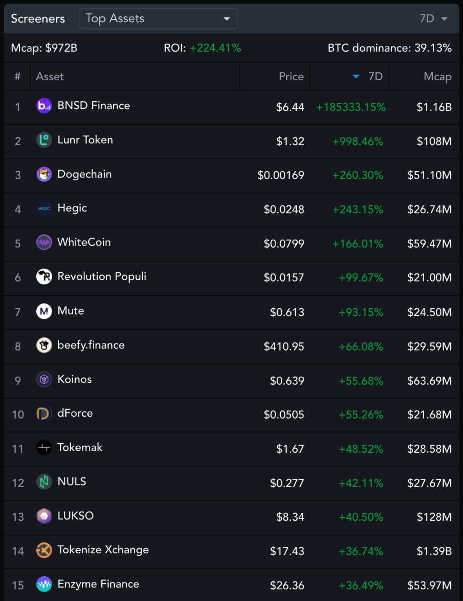 Here are the top 15 performers in the last week from all tokens with a market cap of $20M+.