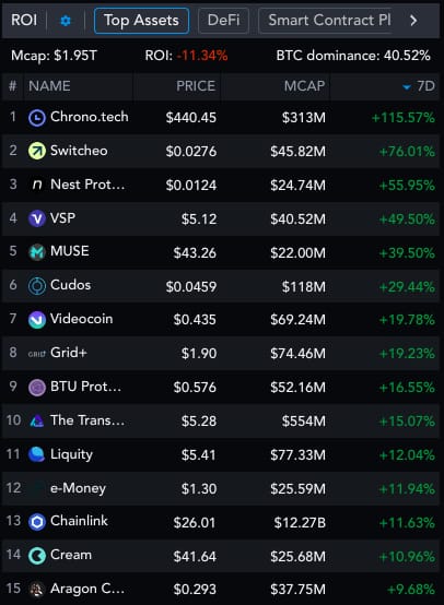 And here are the top 15 performers in the last week from all tokens with a market cap of $20M+.