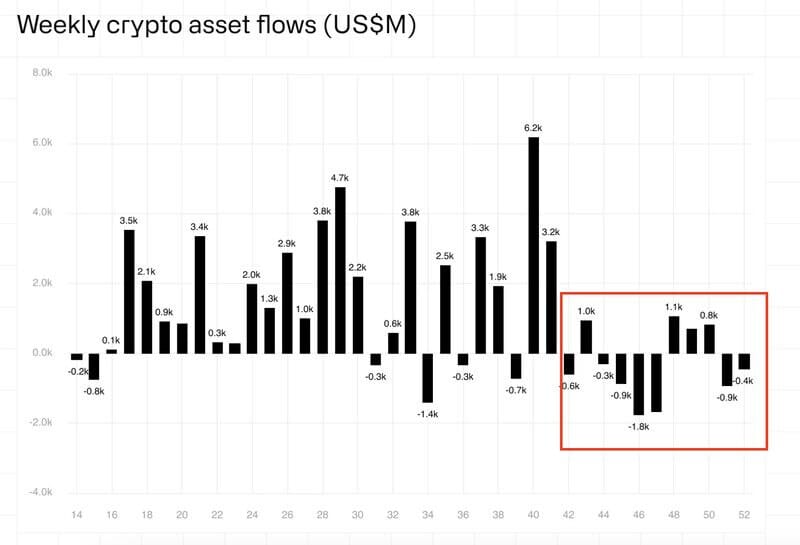 2. Despite multiple relief rallies, digital assets end 2025 with a second straight week of outflows ($446M). Since the October market crash, $3.2B has left the market, with outflows in 7 of the past 11 weeks.