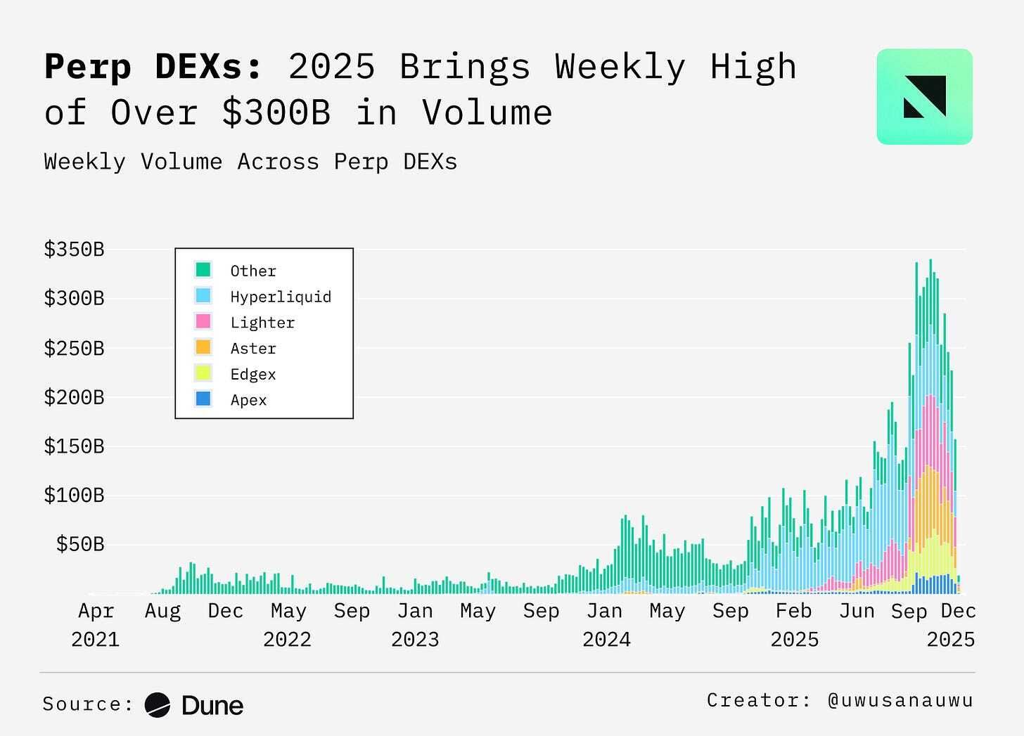 One of the defining shifts of 2025 has been decentralized exchanges beginning to erode the dominance of centralized venues, particularly in perps. In the third quarter of 2025, Solana DEX volume surpassed CEX volume, a milestone driven largely by growth in onchain perps. The crossover highlights a structural change, where leverage and liquidity are concentrating. The trend is expected to extend to other chains, even as DEX perps face headwinds following the Oct. 10 flash crash. Market activity suggests these events slowed momentum but did not reverse the underlying shift.