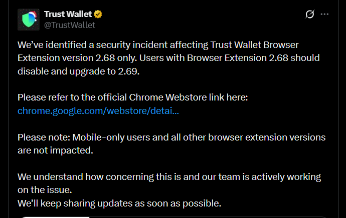 🎭 Trust Wallet users lose at least $6 million in security breach:Crypto wallet provider Trust Wallet said it has identified a security incident affecting a specific version of its browser extension, with onchain sleuth ZachXBT estimating initial losses of more than $6 million.