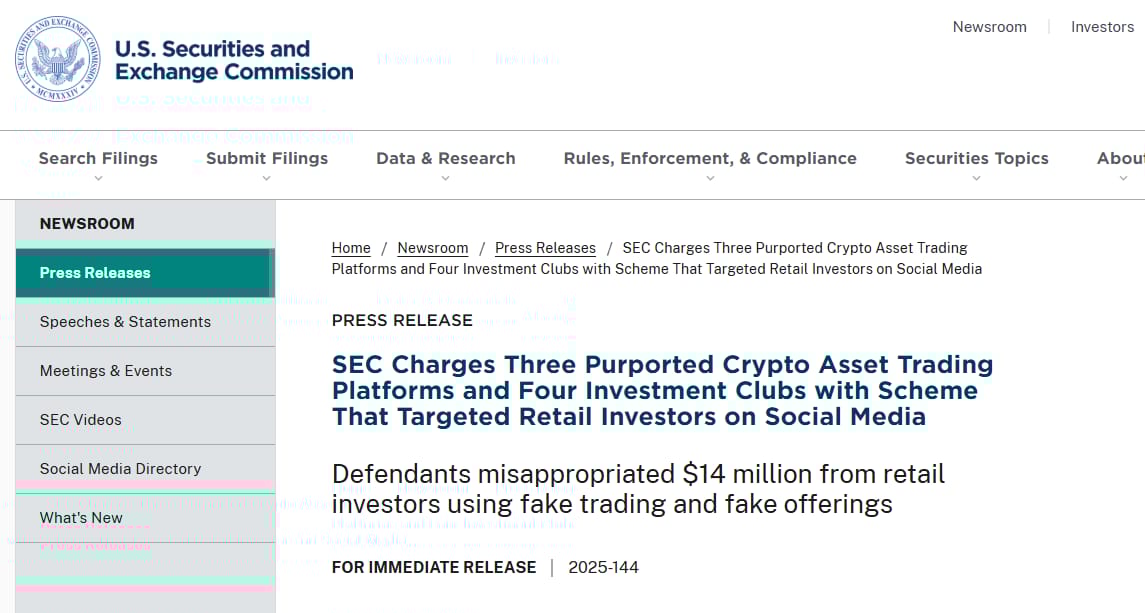 ⚖️ SEC charges $14 million crypto investment scam targeting social media users:The U.S. Securities and Exchange Commission has charged three purported crypto asset trading platforms and four investment clubs for allegedly running an online investment scam that defrauded more than $14 million.