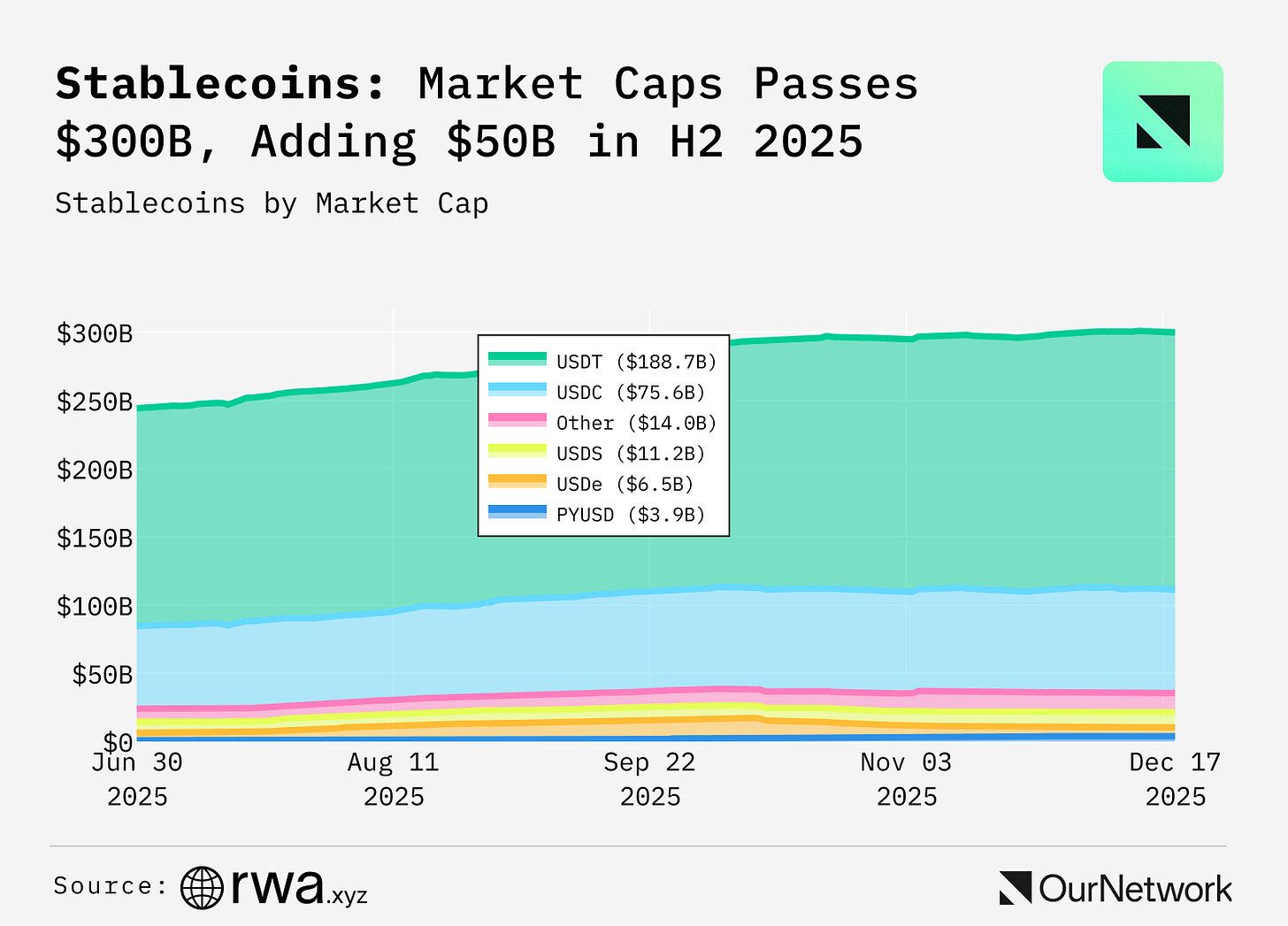 📈 Stablecoin Market Surpasses $300B, Up Almost $100B in 2025