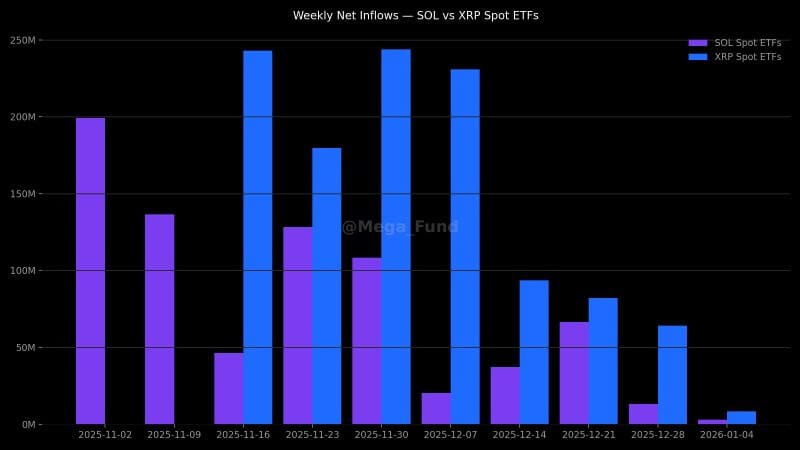 1. One under-indexed dynamic: XRP spot ETF inflows have outpaced SOL every single week since launch.