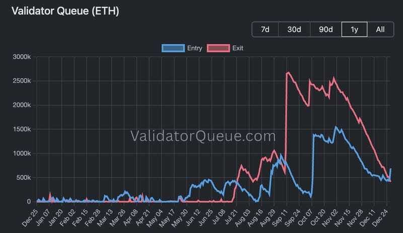 3. Year-end inflection for Ethereum staking: the validator entry queue has flipped the exit queue for the first time since September.
