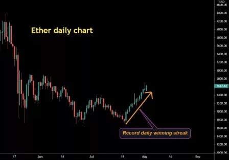 📶 EIP-1559 Is Set For Aug 5 Around 430am PT - DARMA Capital’s Managing Partner Andrew Keys told Reuters, “Ether's current price has yet to factor in the looming software upgrade.” Given the expected software adjustments from the London Hard Fork, ETH has now seen a 12-day winning streak as reported by CoinDesk. EIP-1559 is scheduled to take place at Block 12,965,000 and you can follow the countdown using Etherscan’s Block Countdown here. (Source)