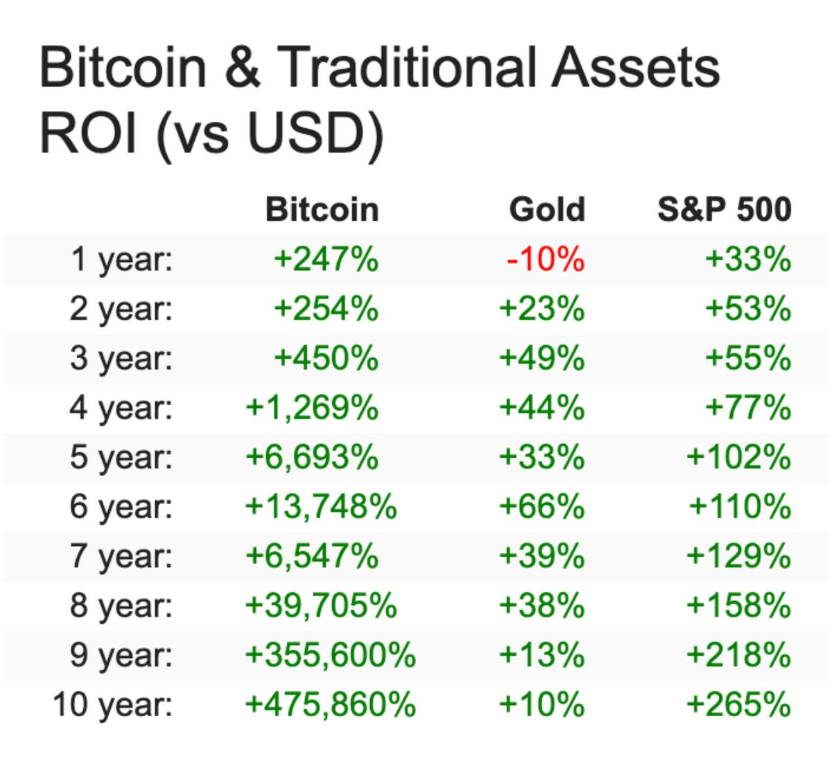 Had you invested $10 in gold ten years ago you would have $110 today. Had you invested $100 in the S&P 500, you’d have $365 today. Had you invested $100 in Bitcoin ten years ago you would have $475,960 today.