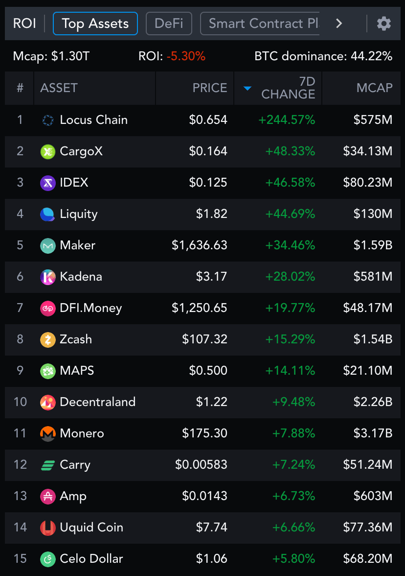 Here are the top 15 performers in the last week from all tokens with a market cap of $20M+.