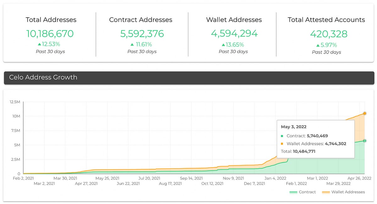 Regarding network growth, Celo has seen explosive activity year to date, with Smart Contracts on the platform increasing by 3.8x and wallet addresses increasing by 4x.