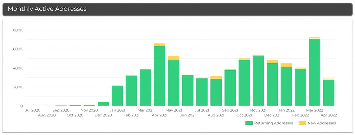 Celo's network activity also shows traction amongst protocol users, with ~300k Monthly Active Addresses returning addresses. What caused this absolute spike in network traffic and smart contract activity was Kickstarter's announcement to move its platform over to the Celo blockchain.