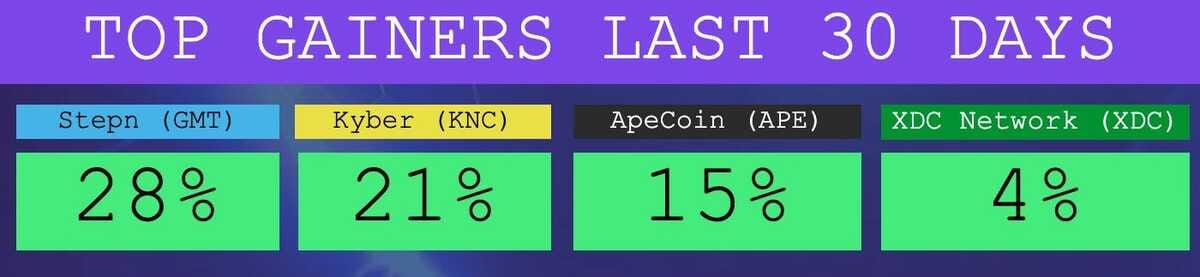 The Top Performers This Month from the Top 100: Stepn is a Web3 Dapp, Kyber is a DEX, Kava is an L1, ApeCoin is a Governance Token.