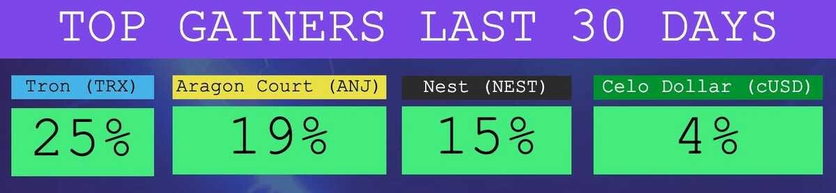 The Top Performers This Month from the Top 100: Tron is an L1, Aragon Court is a Dapp, Nest is an Oracle, Celo Dollar is a Stablecoin.