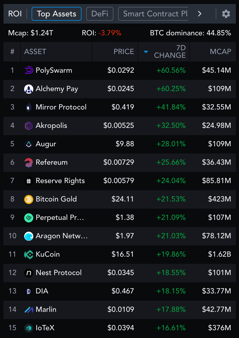Here are the top 15 performers in the last week from all tokens with a market cap of $20M+.