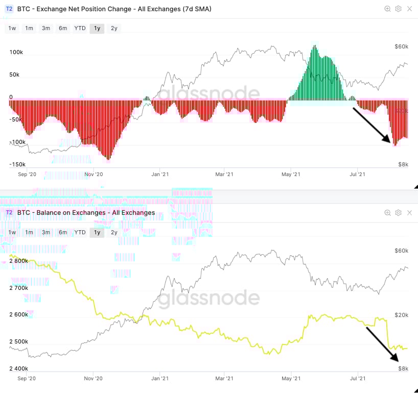 When looking at the activity flow for exchanges, we can see a sustained level of outflows for Bitcoin as the Exchange Net Position Change on All Exchanges. The Balance on All Exchanges continues to trend down.