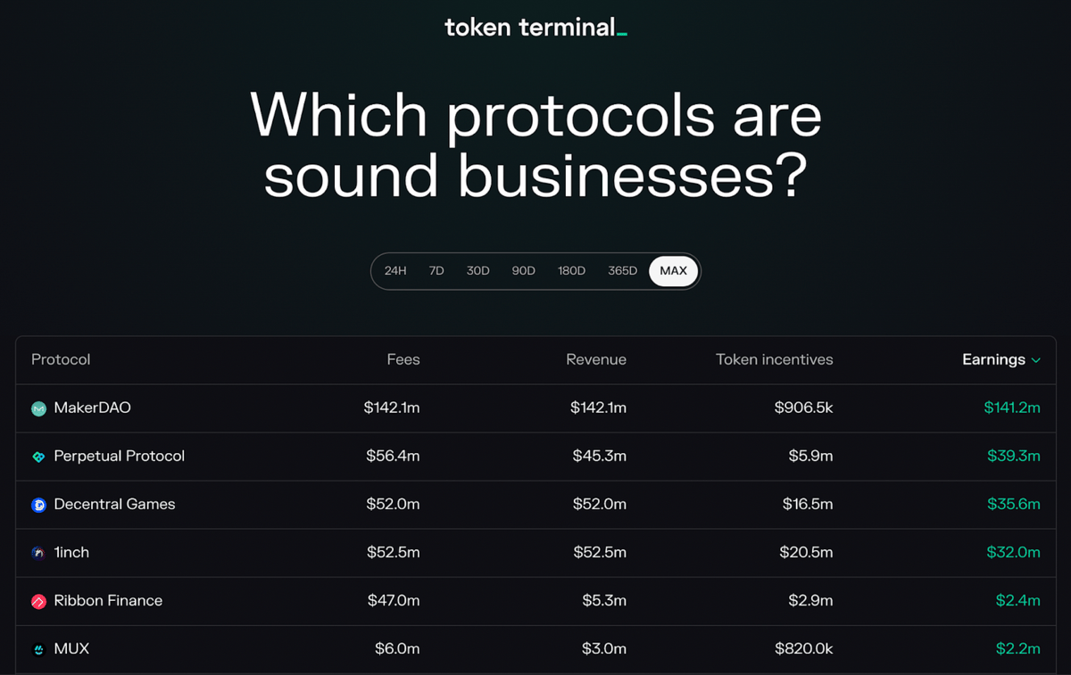 3. Six Protocols With Positive Earnings (Earnings = Revenue – Token Incentives)
