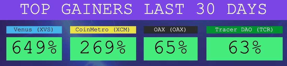 The Top Performers This Month from the Top 100: Venus is a Lending Platform, CoinMetro is an Exchange, Oax is a Foundation, Tracer DAO is a Derivatives Exchange