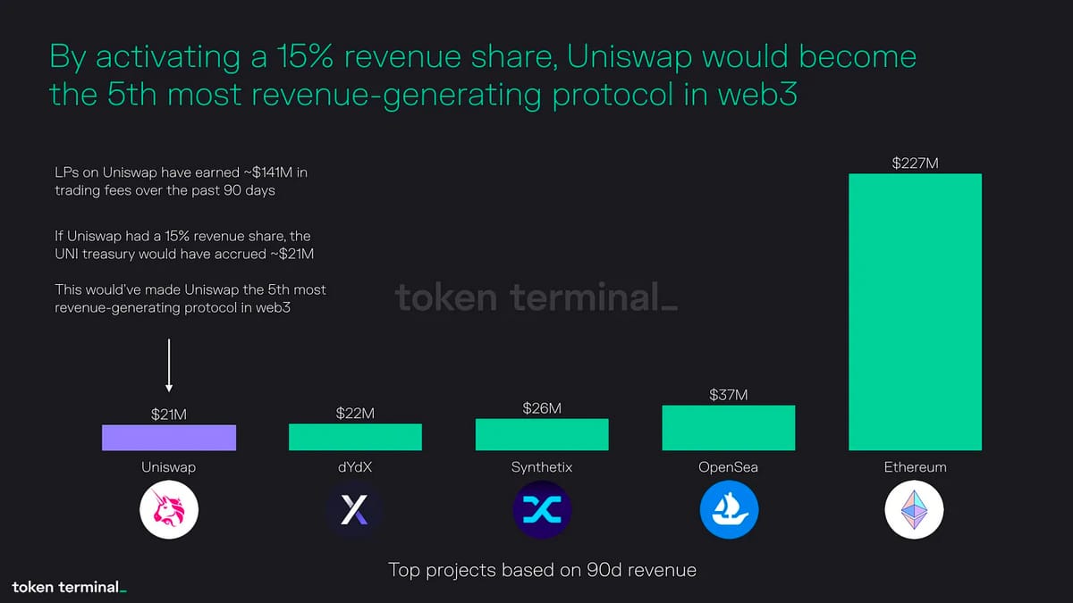 5. Assuming a 15% Revenue Share, Uniswap Would Be the Fifth Most Revenue-Generating Protocol in web3 Based on Total Fees Paid Over the Past 90 Days, Netting Over $21M for UNI Tokenholders.